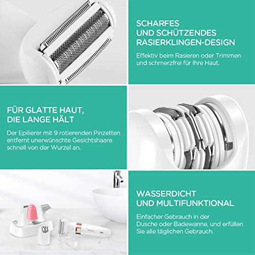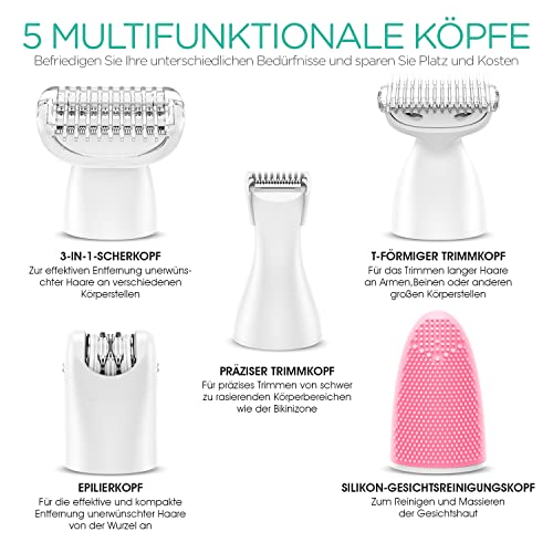 MULTIFUNKTIONALER KÖRPERPFLEGE – Mit 5 funktionellen Köpfen können Sie neben der freien Wahl des Scherkopfes für Ihre unterschiedlichen Rasierbedürfnisse auch den Epilierkopf zur Entfernung Ihrer Gesichtsbehaarung verwenden. Darüber hinaus können Sie auch einen Silikon-Gesichtsreinigungspinselkopf erhalten. Mit diesem vielseitigen damenrasierer müssen Sie nicht viele Geräte kaufen.