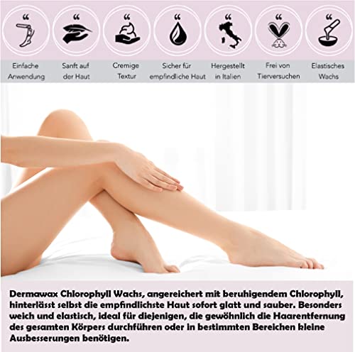 Dermawax Chlorophyll Wachs, angereichert mit beruhigendem Chlorophyll, hinterlässt selbst die empfindlichste Haut sofort glatt und sauber. Besonders weich und elastisch, ideal für diejenigen, die gewöhnlich die Haarentfernung des gesamten Körpers durchführen oder in bestimmten Bereichen kleine Ausbesserungen benötigen.