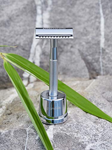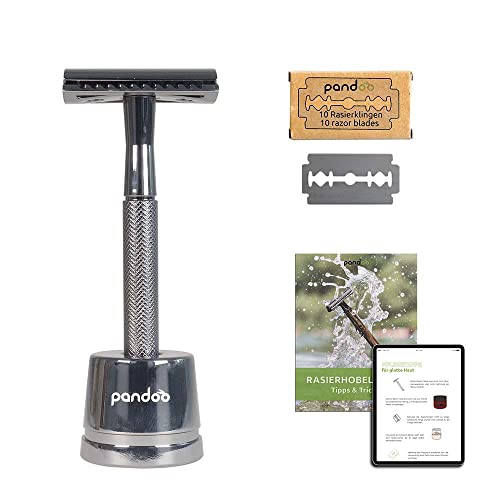 pandoo Rasierhobel inkl. Halterung aus Metall, eBook & 10 Klingen | Zero-Waste Rasierer | Sicherheits-Rasierhobel | Safety Nassrasierer | Männer und Frauen | geschlossener Kamm | Silber