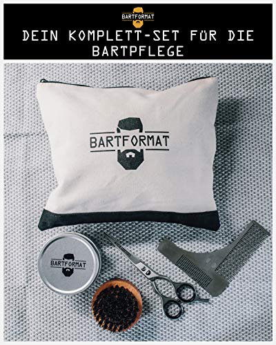 BARTFORMAT® 4-teiliges Bartpflege-Set SCHNITTWUNDER – inklusive XL-Bartschere + Rasurschablone + Bart-Bürste + Kulturbeutel – Hochwertiges Set für die tägliche Bartpflege – Präsent für Männer