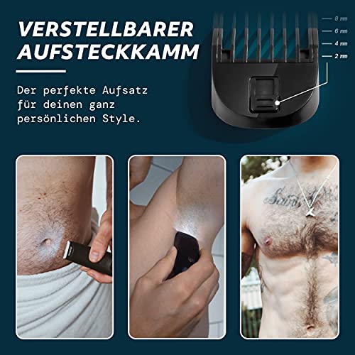 ✅ BRINGT DEIN GROOMING GAME AUFS NÄCHSTE LEVEL – Mit unserem leistungsstarken Körperhaartrimmer bekommst du jeden Wildwuchs in den Griff. Ob im Untergeschoss, unter den Achseln, an Rücken, Brust oder Beinen: Die präzise Keramik-Klinge sorgt für ein besonders sauberes und schonendes Styling – dank des wasserfesten Gehäuses auch bequem unter der Dusche