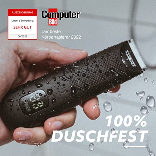 ✅ 100% DUSCHFEST – Der geprüfte wasserfeste Bodytrimmer ist durch die kompakte Größe der ideale Reisebegleiter. Durch das Power Display weißt du jederzeit, wann der Rasierer wieder aufgeladen werden muss. Zuhause ist der Bodyrasierer durch das praktische Charging Dock ein echter Hingucker